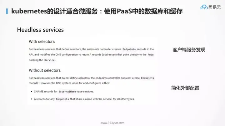 K8S 里面的 headless service 是可以很好地解决这个问题的,只要给外部服务创建一个 headless service,指向相应的 PaaS 服务,并且将服务名配置到应用中。由于生产和测试环境分成 Namespace,虽然配置了相同的服务名,但是不会错误访问,简化了配置。