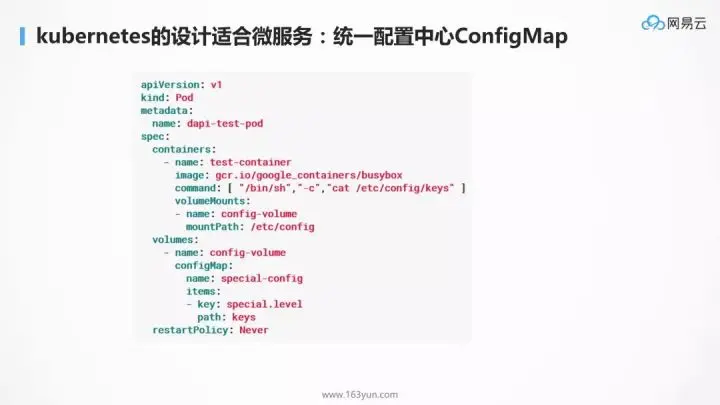 对于配置中心,K8S 提供了 configMap,可以在容器启动的时候,将配置注入到环境变量或者 Volume 里面。但是唯一的缺点是,注入到环境变量中的配置不能动态改变了,好在 Volume 里面的可以,只要容器中的进程有 reload 机制,就可以实现配置的动态下发了。