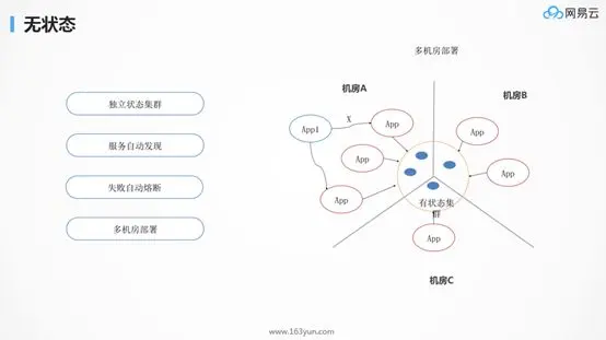 无状态。做好持续集成之后,第一件事情应该是把应用分为有状态(Stateful)和无状态(Stateless)两个部分,并且使大部分应用是无状态的,这样可以更好地适应弹性伸缩。即便Kubernetes已经可以支持有状态应用的部署,刘超还是建议在应用层尽量实现无状态,使得有状态应用聚集在少数的集群里面。有状态最重要的是数据库和缓存,通常内存数据放在缓存,需要持久化的数据放在数据库里。