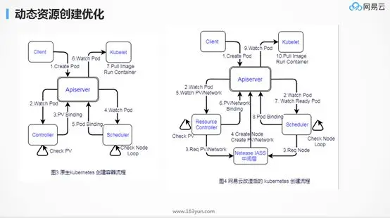 动态资源创建的实现,网易云改造了Kubernetes创建流程,主要是监听Pod创建的事件,由Resource Controller判断有没有足够的Volume资源、Network资源,Schedule判断有没有足够的Node资源,有则直接绑定,无则动态申请之后再绑定,然后由Kubernetes下发。添加资源的时候,只有应用层和机房两层,机房只需要把物理机添加到IaaS层,不需要管上面是否有Kubernetes,虚拟机的创建全部是动态的,应用层只管应用层的事情,中间都是透明的。