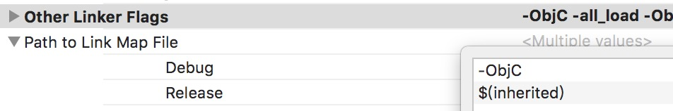 如果此时编译还报错(本人就是这种情况),那么在Build Setting中的Linking下的Other Linker Flags下也要添加$(inherited),如下: