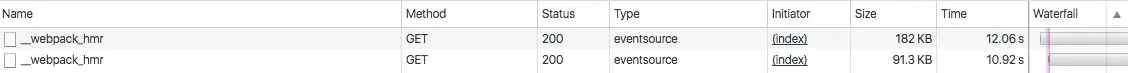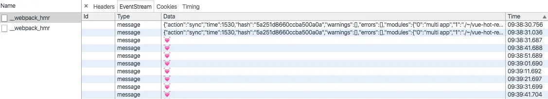 __webpack_hmr是一个type为EventSource的请求, 从Time栏可以看出:默认情况下,服务器每十秒推送一条信息到浏览器。