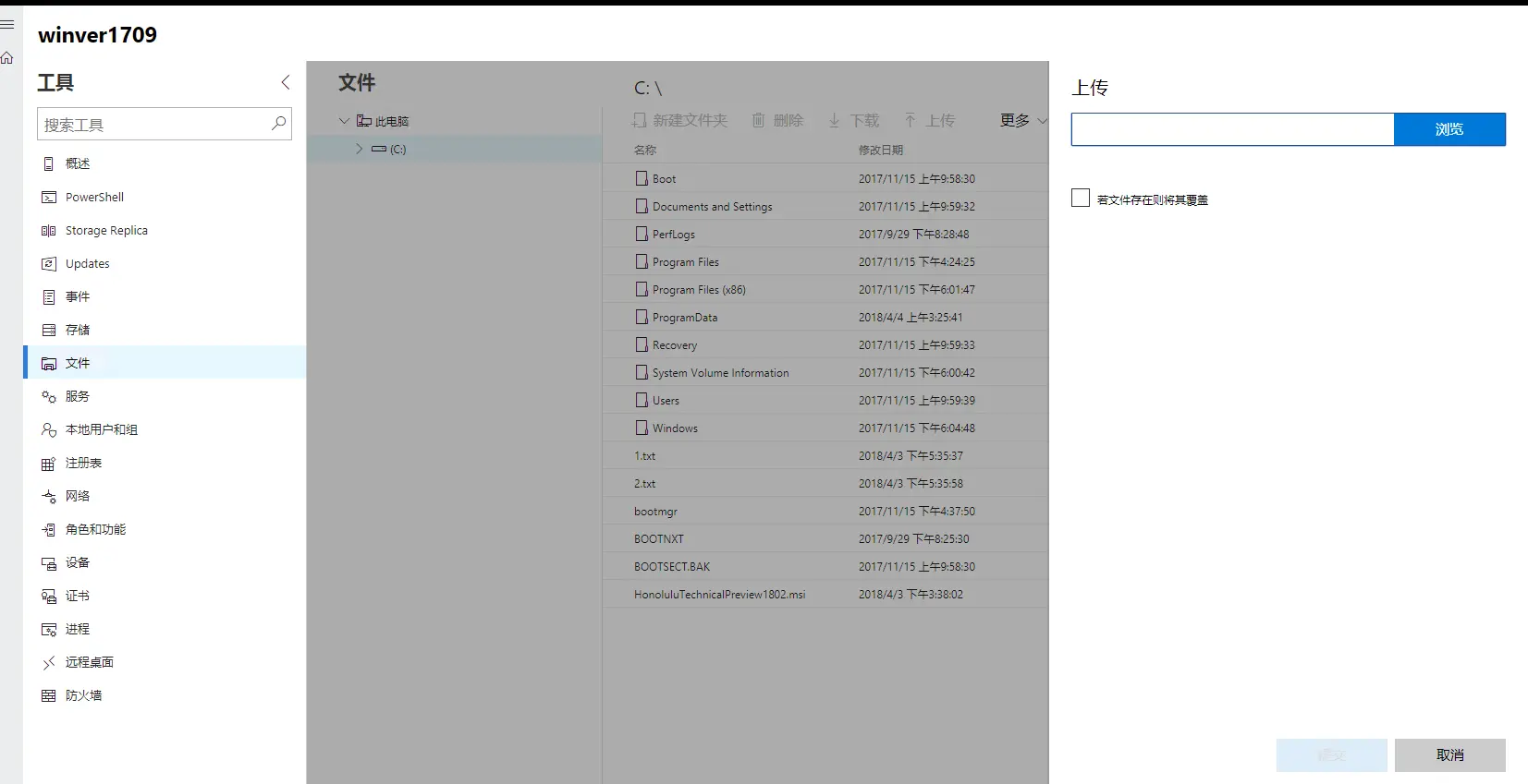 这里假定要复制的文件在客户端机器上。通过PowerShell远程和通过Project Honolulu的方法都在客户端机器和Server 1709的被管理机器已经按上面的方法进行了配置。