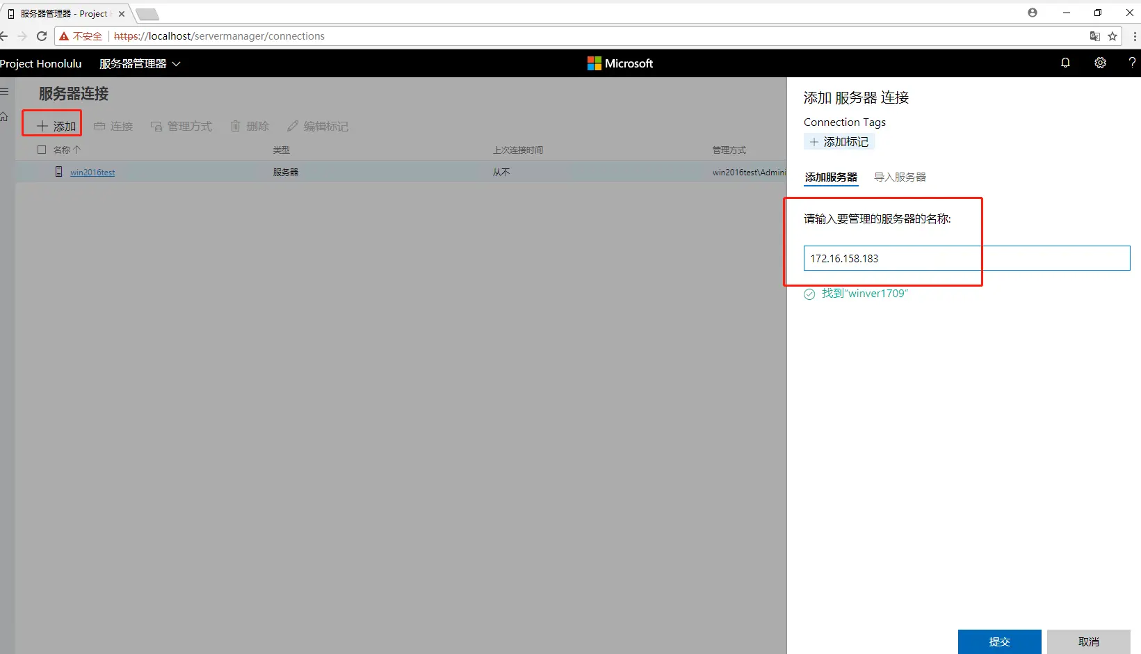 - 安装完成后,可以打开 https://localhost/ 然后添加我们需要管理的Server 1709的机器的地址。