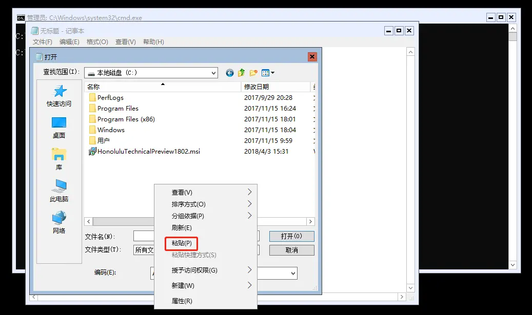 - 在远程机器上打开notepad.依次 文件 -> 打开。在打开对话框里,选择一个盘的路径,右击粘贴。文件就复制过来了。这是我最喜欢的一种方法。
