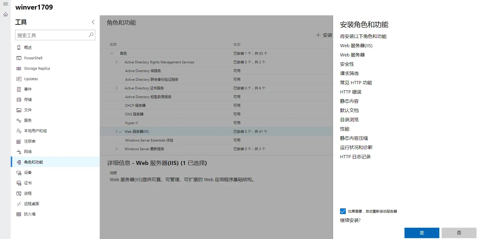 依次点击被管理的机器-> 角色和功能 -> 选择 Web服务器 并确定需要的功能。