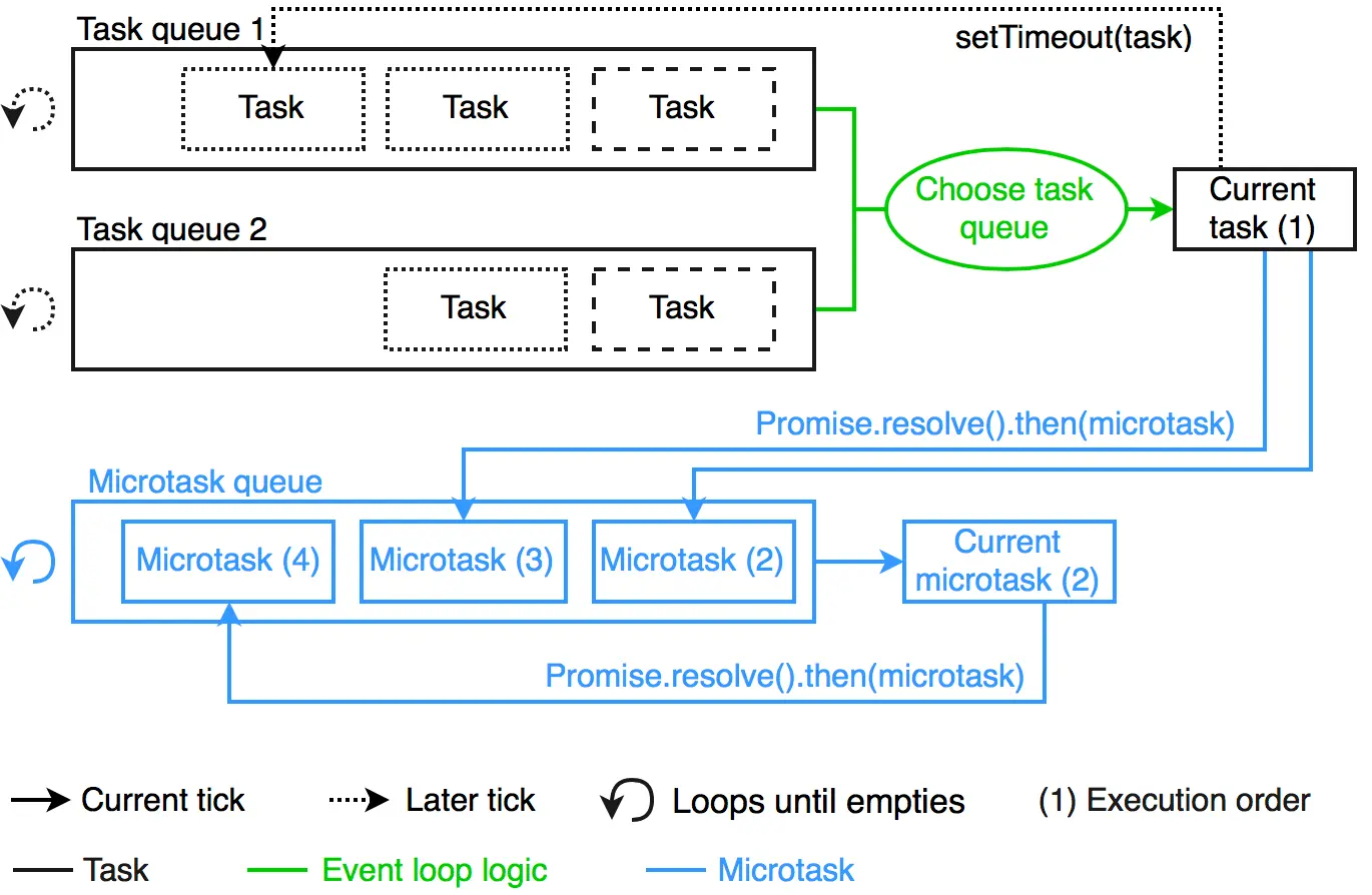 幸运的是,事件循环还有一个单一队列叫做微任务队列。在每个 tick 之中,每当当前任务执行完毕之后,微任务队列都被完全清空。