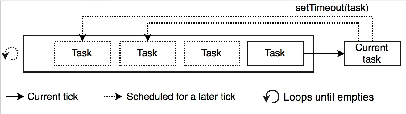 任务是指可以在循环中安排其他任务的同步代码片段。调度新任务的一种简单的编程方法是 setTimeout(taskFn)。