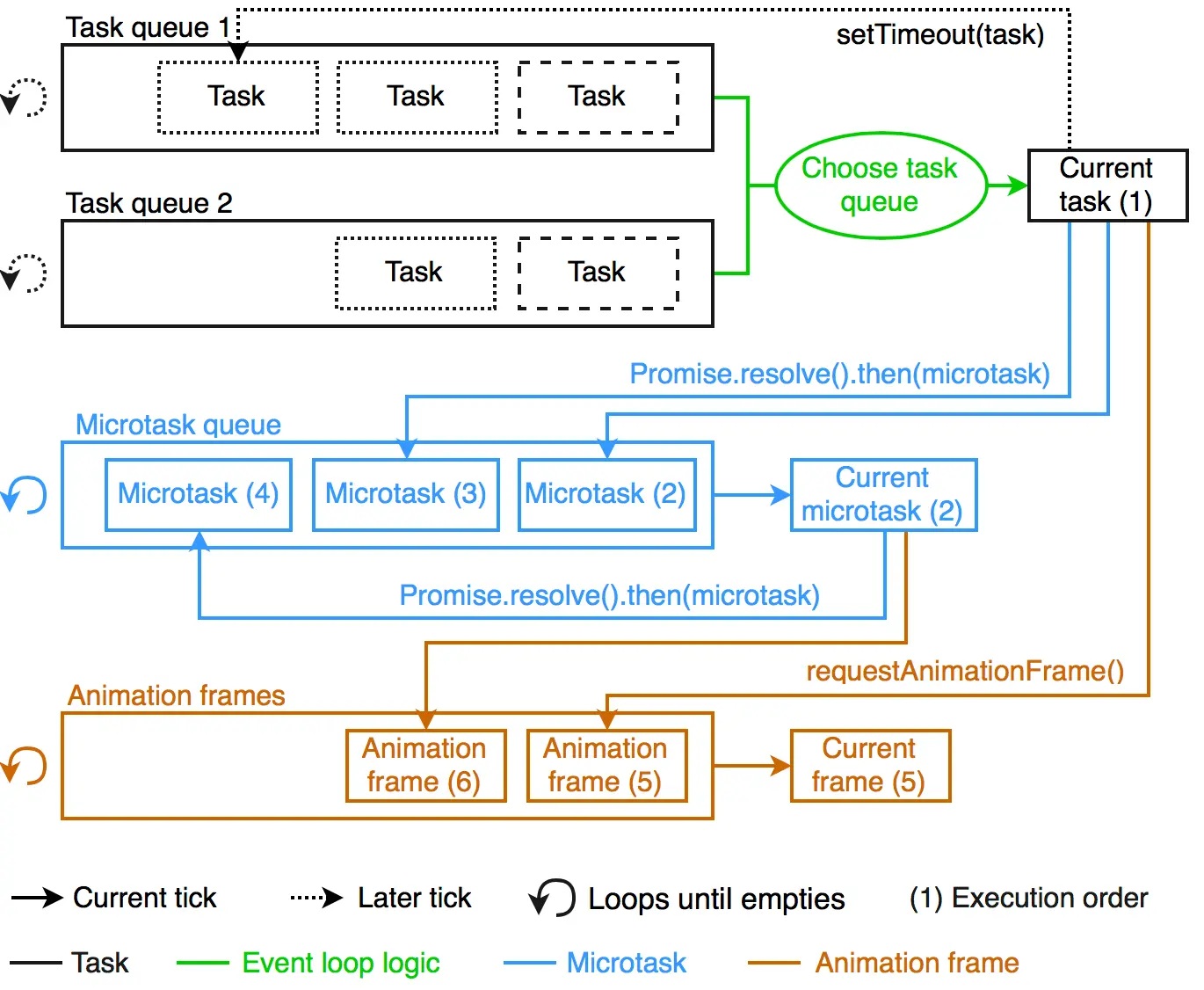 一次事件循环的遍历叫做 tick,其中执行的代码称为任务。一个 tick 之中只能有一个微任务队列,一个 tick 之中可以有多个任务队列。