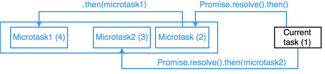 setTimeout(fn, 0) 是完全不可预知的。用不同的方法注册微任务也会导致混淆执行顺序。例如,在下面的示例中, microtask2 将会错误地在 microtask1 之前执行。