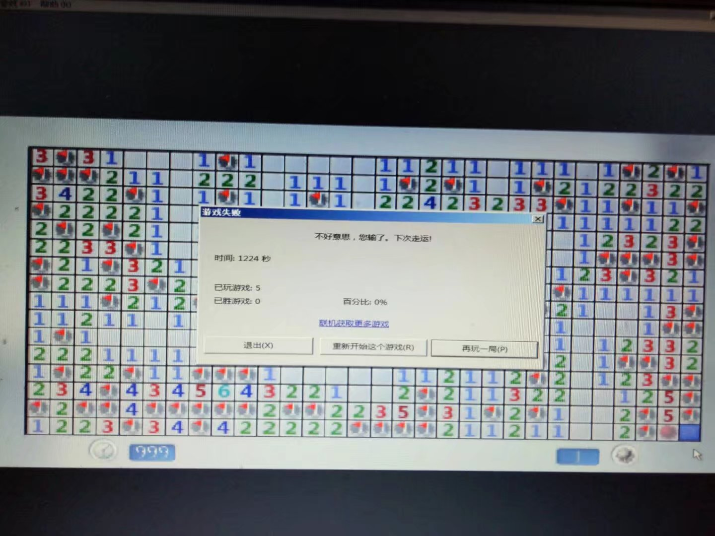 前阵子无聊,LOL也不是很想玩,发现了电脑中自带的扫雷,当时在一个神奇的地方,用的是一个windows2000的系统界面但是扫雷确是win7的样式,玩了几句几局,其中有一局很崩溃,我先上图为敬。