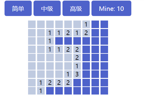这个也蛮好实现,右键按下的时候将周围没点击过也没被标记过雷的方格添加带有别的颜色的class,然后记录周围八个方格标记的雷的个数,然后在右键松开的时候移除此class,并判断刚记录的标记的雷的个数和当前点击的格子的数值是否相等,然后去做下一步处理。