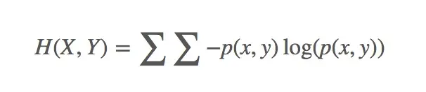 上面那个是一个变量 X 的熵,多个变量的联合熵,比如两个变量 X 和 Y 的联合熵表达式为: