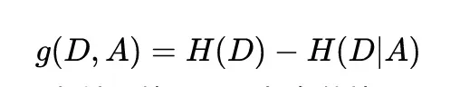 特征 A 对训练集 D 的信息增益记为g(D, A),定义为集合 D 的经验熵H(D),与特征 A 给定条件下 D 的熵H(D|A)之差,即: