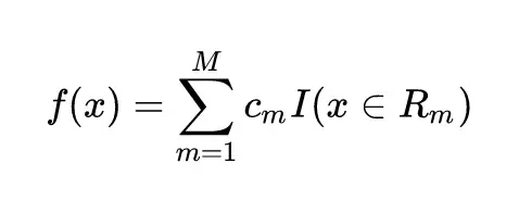 假设已将输入空间划分为 M 个单元,并且在每个单元 R1, R2, …, Rm,并且在每个 单元 Rm 上有一个固定的输出值 Cm ,于是回归树可以表示为: