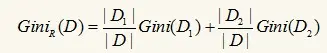 对于样本 D,如果根据特征 A 的某个值 a,把 D 分成 D1 和 D2 两部分,则在特征 A的条件下,D 的基尼系数表达式为: