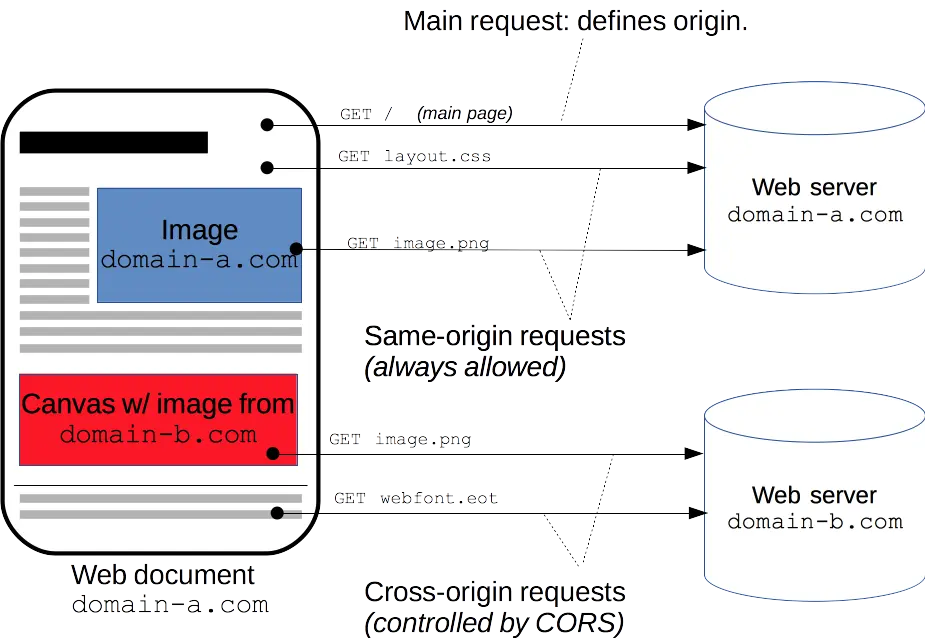 An example of a cross-origin request: A HTML page served from http://domain-a.com makes an <img> src request for http://domain-b.com/image.jpg.