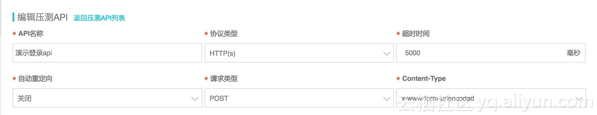 上述配置信息中,“基础配置”及“压测URL定义”是每个API的必填项,其他4项作为满足不同API的选择项。