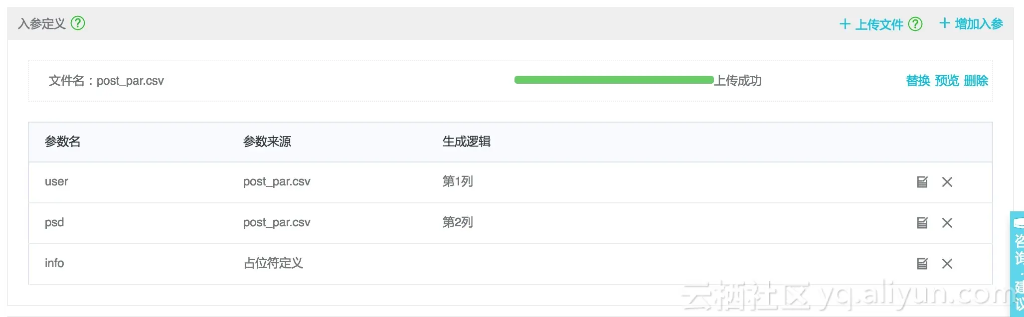 入参定义可以通过上传参数文件及占位符的方式,来定义入参变量。前者是用于上传一些必要的数据,比如请求中需要的用户名、ID等,而后者(占位符)主要是用于占位,然后在场景中设置和其他API的出参关联,实现参数传递的功能。关于文件上传,文件格式必须为csv,且大小不超过60MB。文件中每列代表不同的参数属性,每行为一个请求中多个参数的组合,每格只需填写value即可,也可以只有一列,如果请求中某些参数需要强关联则构造在一个csv文件中并上传,相应的两个入参变量都定义起来。而文件上传之后会自动读取里面的列并展示在下方的入参定义中,您只需要定义入参的变量名即可,不需要的再删除。占位符的入参需要手工增加和定义。