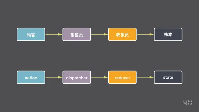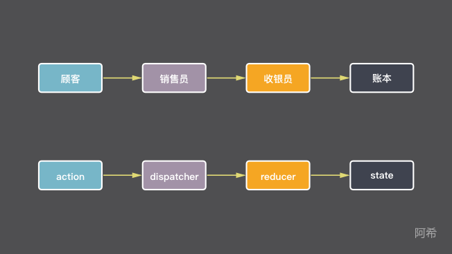 阿大分析了一下水果店的营业模式。其实就是处理每一位顾客的需求,然后记账看看每天的盈亏。那么抽象成程序就是监听顾客的行为,并把每个行为的结果都记在账上,这正好是 redux 所擅长的。阿大胸有成竹,说着就开始写了起来: