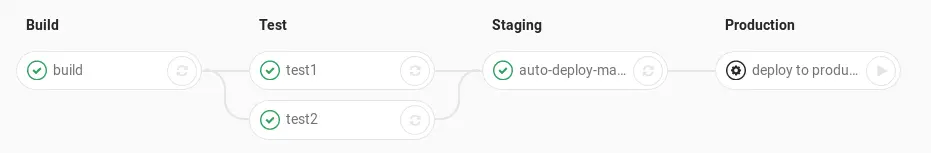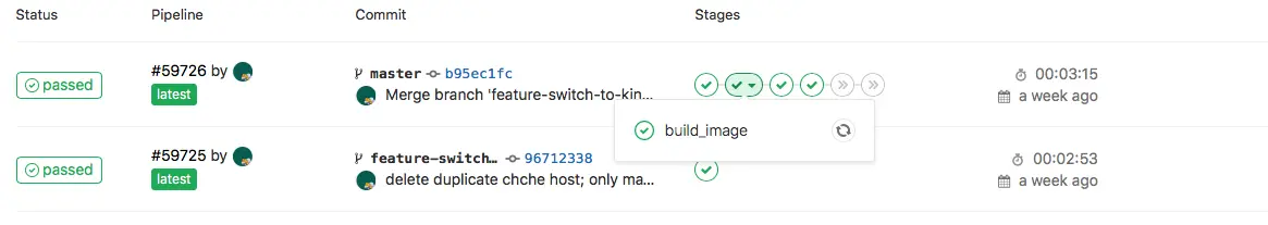 组员新建分支,开发功能,创建一个 Merge Request,这时候触发第一个 stage: test。test 中包含所有单元测试的 job。当 test 通过后,组长 Review Merge Request,这其中可能还会提一些修改意见,组员进行对应的修改,再次触发 test。当且仅当组长 Review 通过后,执行 Merge,这时候开始触发第二个 stage: build-image(也就是构建 Docker Image)。构建成功后进入到 deploy-integration。集成测试没有问题,再依次deploy-staging-> 预发布验证 -> deploy-production。至此整个 CI/CD 工作流就完成了。