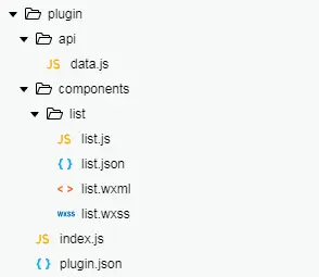 api: 接口插件文件夹,可以存放插件所需的接口components: 插件提供的自定义组件文件夹, 中自定义组件可以有多个index.js: 插件入口文件,可以在这里export一些js接口,供插件使用者使用plugin.json: 插件的配置文件,主要说明有哪些自定义组件可以供插件外部调用,并标识哪个js文件是插件的js接口文件,默认的配置形式如下: