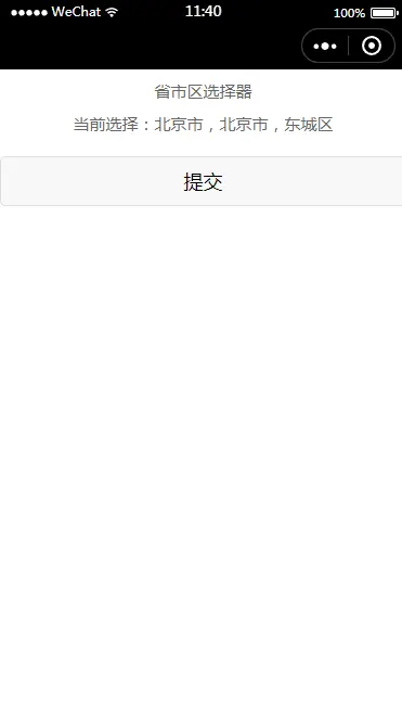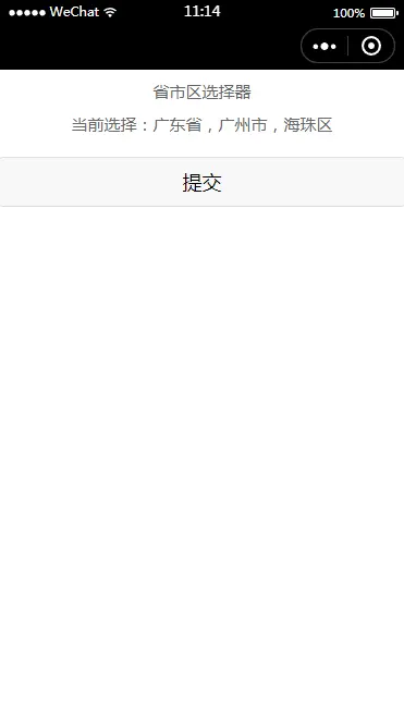ok,老规矩,首先先定一个小目标,我们要实现一个省市区选择器的插件,并在点击提交按钮的时候把数据提交过去,大整效果如下图所示~