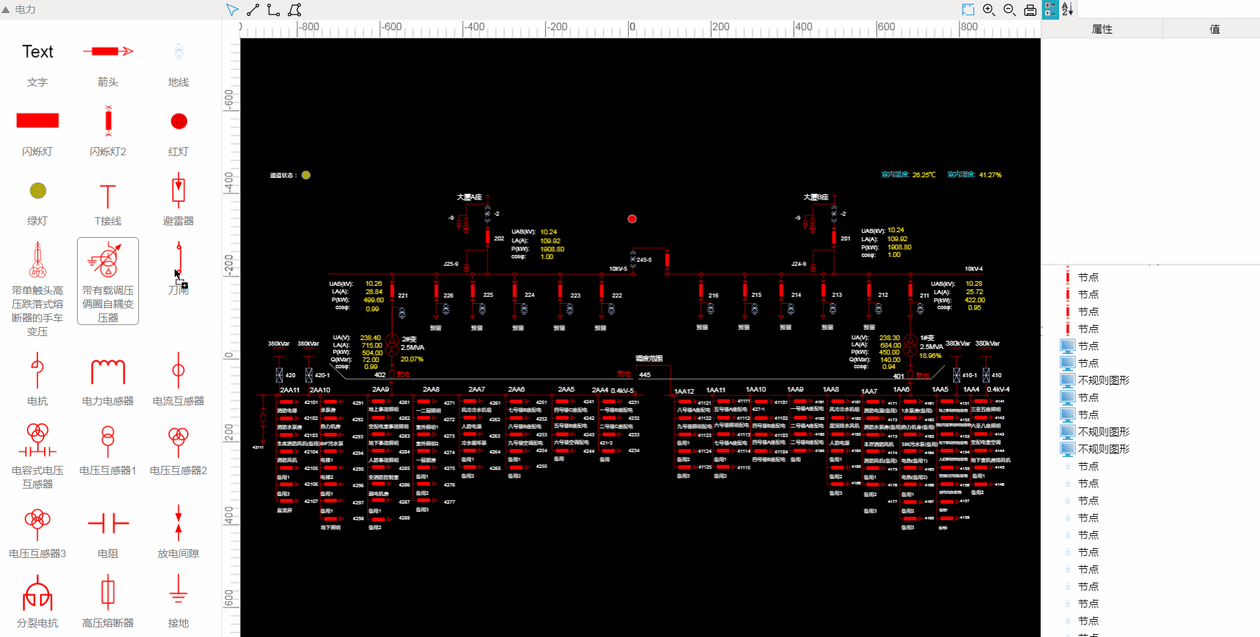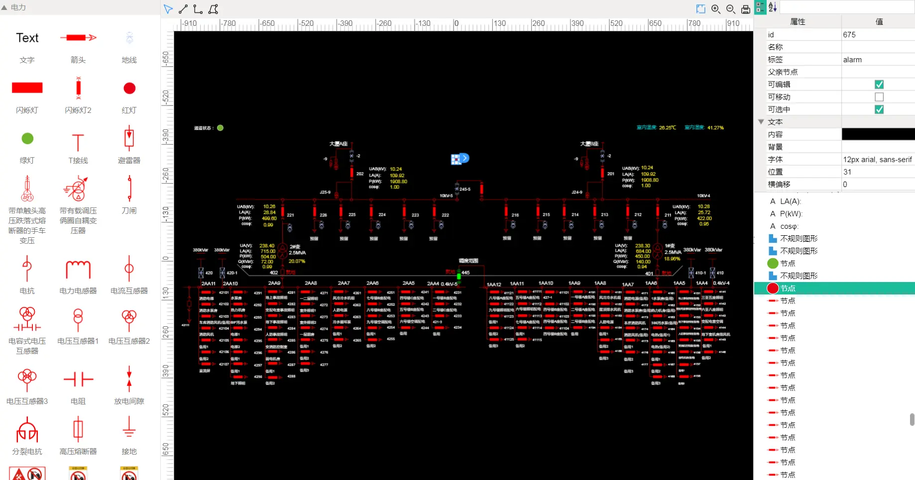 我在 graphView 拓扑图的场景中央添加了一个 json 场景,通过 dm.deserialize(datamodel_config) 反序列化 json 场景内容导出的一个电信行业的图纸。HT 独特的矢量引擎功能满足电力行业设备种类繁多、设备图元和线路网络需无极缩放、绑定量测数据实时刷新等需求;三维呈现技术使得电力厂站和变压器等设备 3D 可视化监控成为可能。