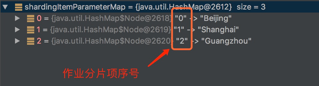 JobCoreConfiguration.shardingItemParameters="0=Beijing,1=Shanghai,2=Guangzhou") 解析结果: