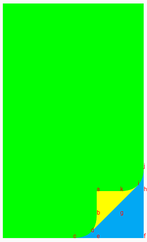简单总结一下,a是触摸点,f是触摸点相对的边缘角,eh我们设置为af的垂直平分线,则g是af的中点,ab、ak、dj是直线;曲线cdb是起点为c,控制点为e,终点为b的二阶贝塞尔曲线;曲线kij是起点为k,控制点为h,终点为j的二阶贝塞尔曲线,区域A、B、C就由这些点和线划分开来。我们将这些点称为标识点,下一步就是模拟设定a和f点的位置,将这组标识点绘制到屏幕上来验证我们的计算公式是否正确,创建BookPageView