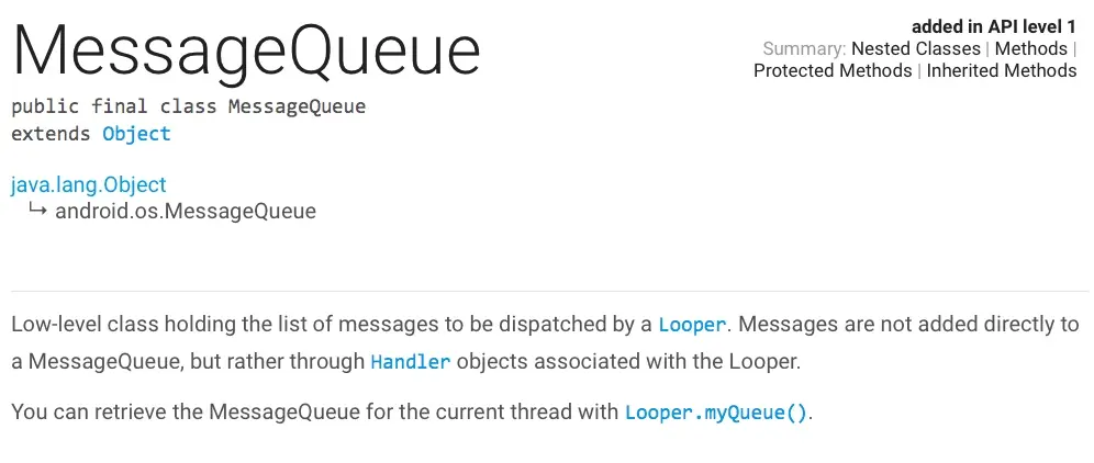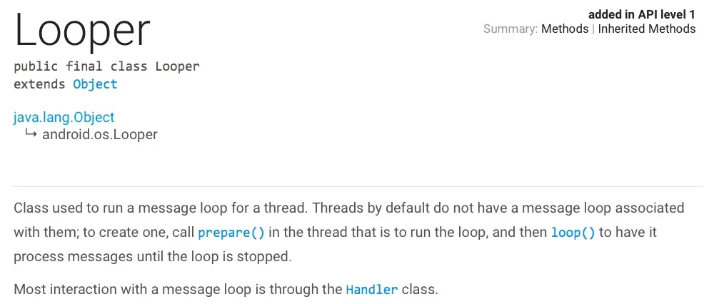 从官网的介绍我们可以看出来,Looper 通常是和线程相关的,用于在线程上开启一个消息循环(MessageQueue),然后不断的处理消息循环中的消息,一直到消息循环终止。