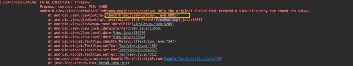 可以看到,正是这里抛出的异常。从上面的分析可知,是我们在子线程中 setText 的时候,抛出的这个异常。