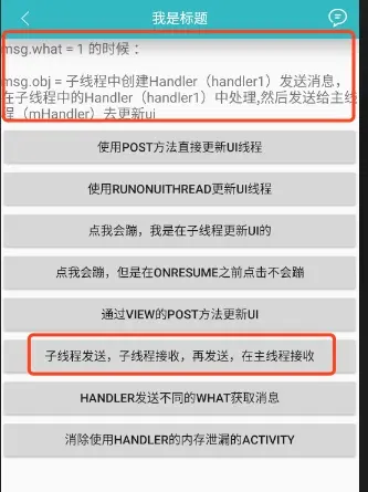 mHandler.sendMessage(mHandler.obtainMessage(1, "子线程中创建Handler(handler1)发送消息,在子线程中的Handler(handler1)中处理,然后发送给主线程(mHandler)去更新ui"));