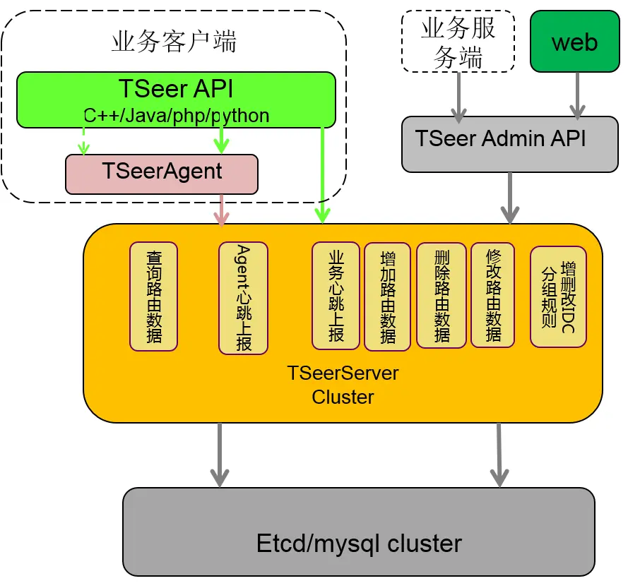 TseerServer是整个Tseer的枢纽与核心模块。 当新节点上线时,需要先通过WEB管理平台在Tseer服务集群注册,将其网络位置信息记录在Tseer系统中。当需要对节点进行下线或者其他修改时,也需要在WEB管理平台就行相关操作。被调节点也会定时上报心跳给TseerServer,server端会屏蔽心跳超时的节点使其无法被调用。