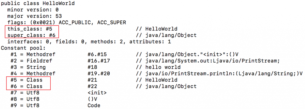 类索引, this_class 的值必须是对 constant_pool 表中项目的一个有效索引值。constant_pool 表在这个索引处的项必须为 CONSTANT_Class_info 类型常量,表示这个 Class 文件所定义的类或接口。父类索引,对于类来说, super_class 的值必须为 0 或者是对 constant_pool 表中项目的一个有效索引值。 比如图6中红色圈出来的:this_class 指向#5,#5的值是HelloWorld;super_class指向#6,#6的值是java/lang/Object。interfaces_count