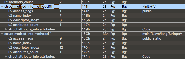 方法表,methods[]中每一项都是一个 method_info 结构的数据项,用于表示当前类或接口中某个方法的完整描述(包括方法名,方法签名,方法修饰符,方法中的代码)。methods[]数组只描述当前类或接口中声明的方法,不包括从父类或父接口继承的方法。access_flags描述的是方法的修饰符;name_index描述的是方法名的简单名称;
