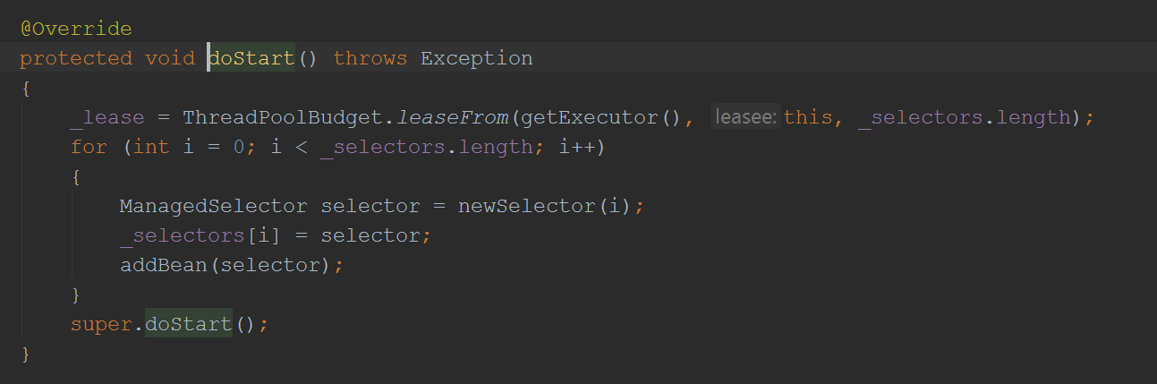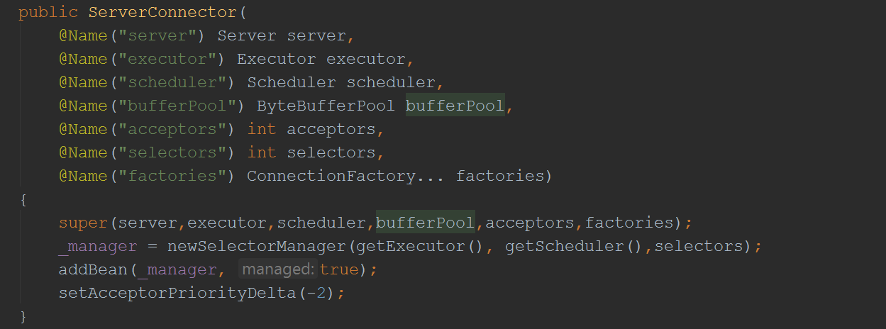 可以看到在ServerConnector的构造函数里会创建一个SelectorManager,然后加到它的bean里面(这里其实体现了Jetty的一个设计模式,就是设计了一个containner,把相关的模块放到这个containner里面,启动该container(调用doStart方法)就会连带启动里面的模块(调用模块的doStart方法),