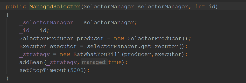 我们看到它把一个EatWhatYouKill对象加到它的bean里面,那就意味着在启动ManagedSelector时也会启动这个EatWhatYouKill对象(调用它的doStart方法),同样我们先来看一下EatWhatYouKill的构造函数: