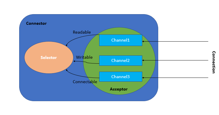 从上图可以看到,Acceptor负责接收网络连接,封装成一个channel,然后把该channel注册到Selector,由selector来monitor这个channel的状态是Readable还是Connectable还是Writable, 针对不同的状态来做不同的事,比如readable的时候,也就是TCP的receive
