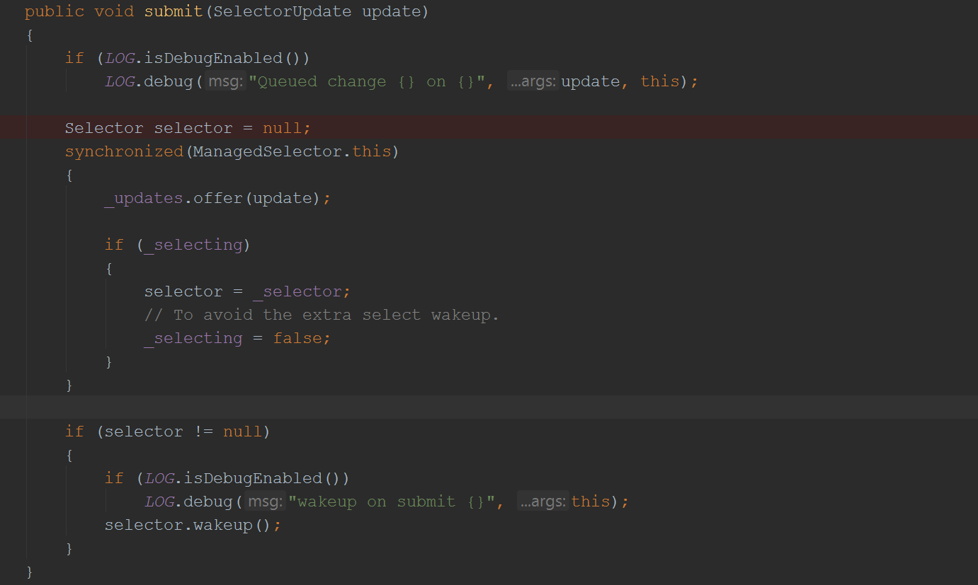 到此,我们就清楚地看到Selector跟Accptor是如何联系到一起了,当然这里的Selector是封装后的Selector,我们先看一下它的submit方法: