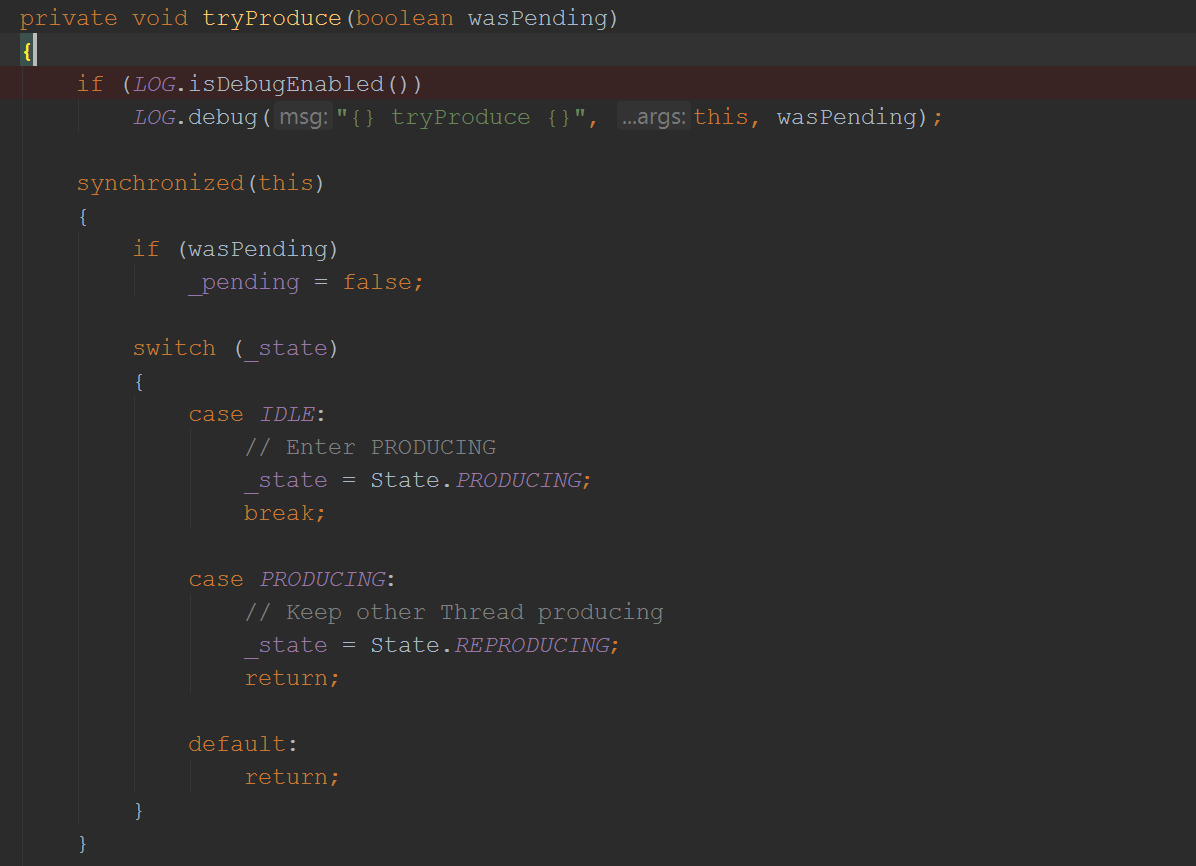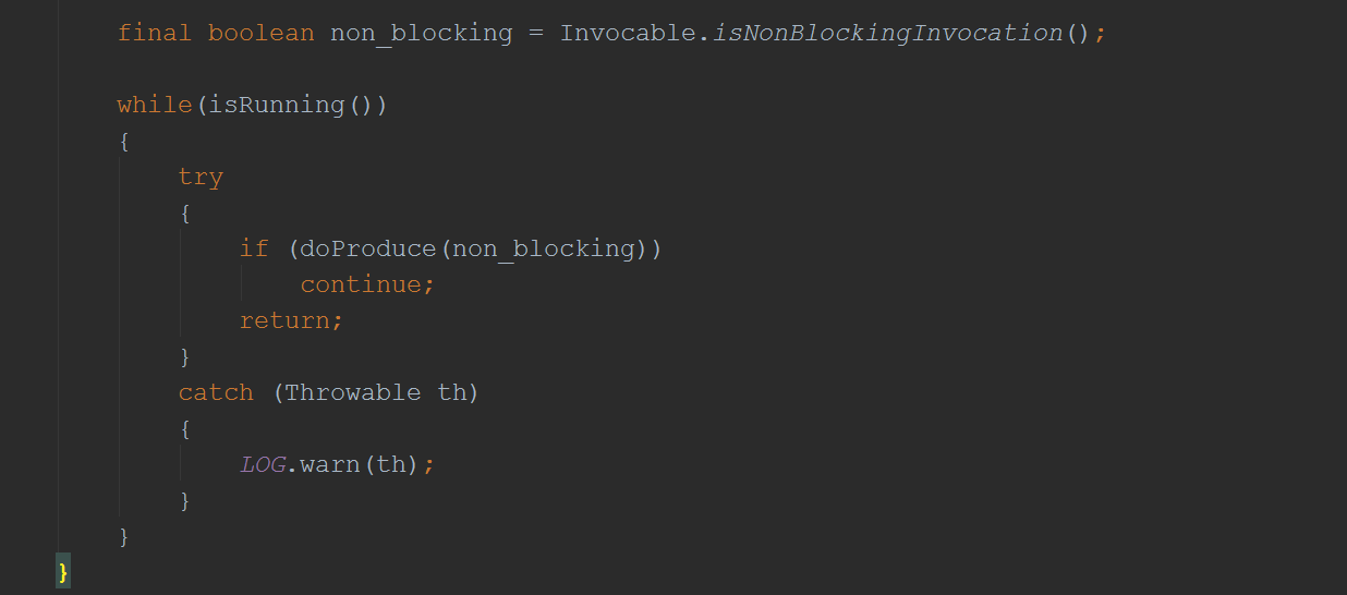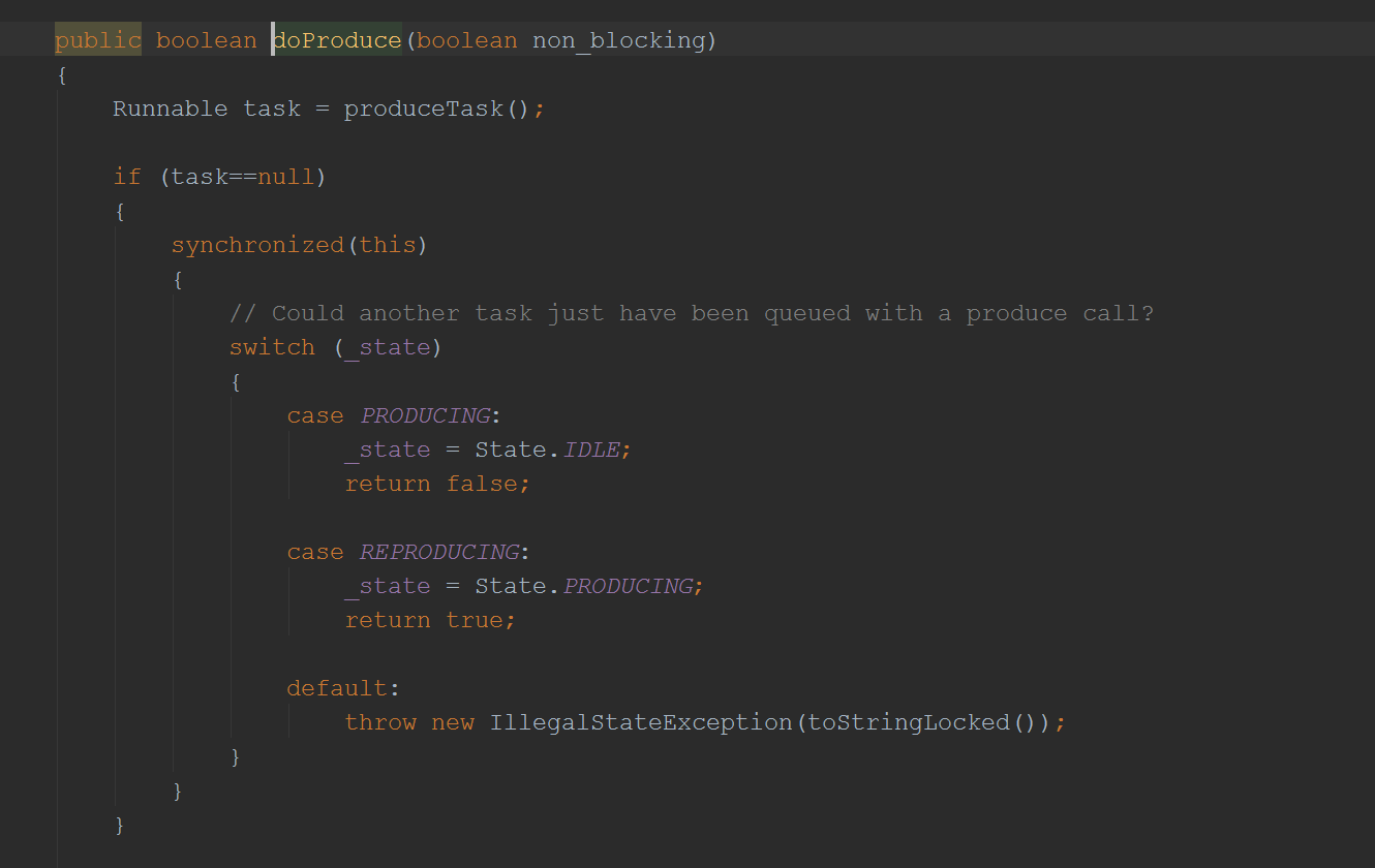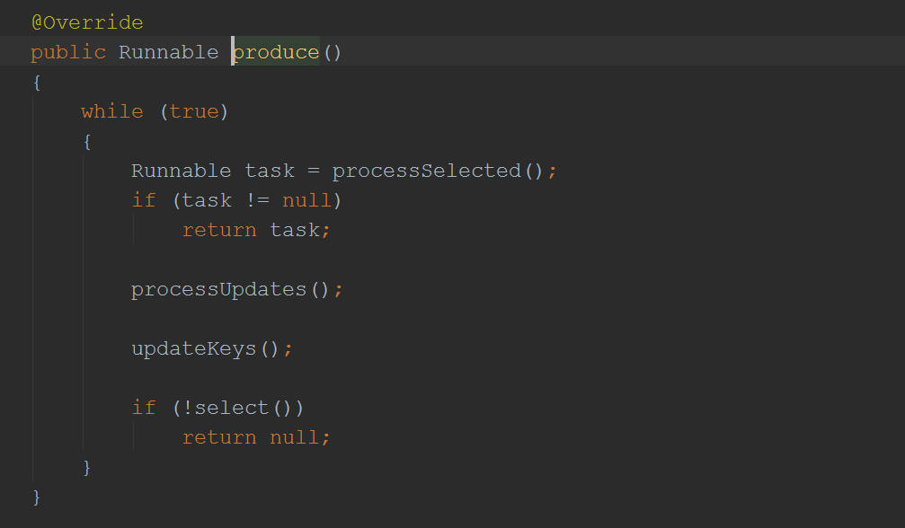 然后就通过线程池去执行了EatWhatYouKill的的produce方法(这里用的是Java8的语法,而一个方法其实就是一段可执行的字节码,自然是runnable的):