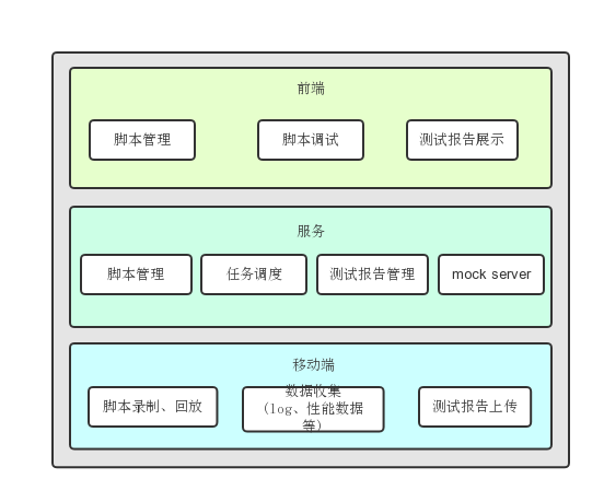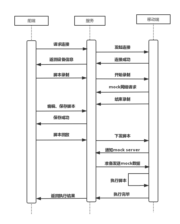 平台主要分为前端、服务、移动端3层。其中前端为 Web 页面,是与用户交互的入口,提供脚本管理、脚本调试、测试报告查看等功能。服务层是前端和移动端的承接层,负责脚本管理、脚本执行任务调度、测试报告生成、网络请求 mock 等。移动端以 SDK 的形式接入被测 App,记录UI操作和控件、代理网络请求并发送给 mock server、回放脚本、记录 log 和性能数据等。