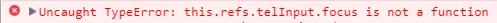 上面的例子中, <TextInput> 可以理解为 HTML 中的 <input> 标签, <JDTouchable> 是点击事件组件。因此,该示例是点击下面的按钮,让上面的输入框主动获得光标, this.refs.telInput 也正是获取到 input 输入框的常规用法,但是!在转成 H5 之后却报错了: