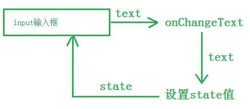 正如上面介绍的 <TextInput> 组件,该组件提供 onChangeText 事件来监听输入框内容的变化,通过获取到输入的 text 值改变 state 值,再赋值给 <TextInput> 组件的 value 值,来达到更新 <TextInput> 的内容,其逻辑如下图所示: