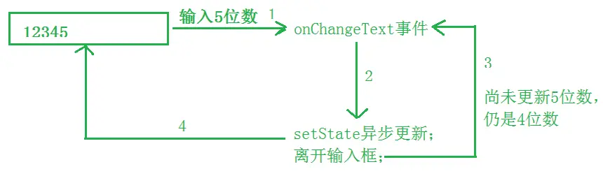 从动态图中可以看出,输入框在满 4 位之后,在输入第 5 位数字时光标移出输入框,且输入框中保留了 4 位数字,这是这么回事呢? 要知道 setState 可能是异步更新的,也就是说 onChangeText 事件中有可能 state 尚未更新成功,由于输入框中已经满了 5 位,所以光标离开输入框,而离开事件又再次执行了 onChangeText 事件,所以导致这时传给 onChangeText 的参数仍是 4 位,简单来说就是光标在离开输入框的时候 state 值尚未更新成 5 位: