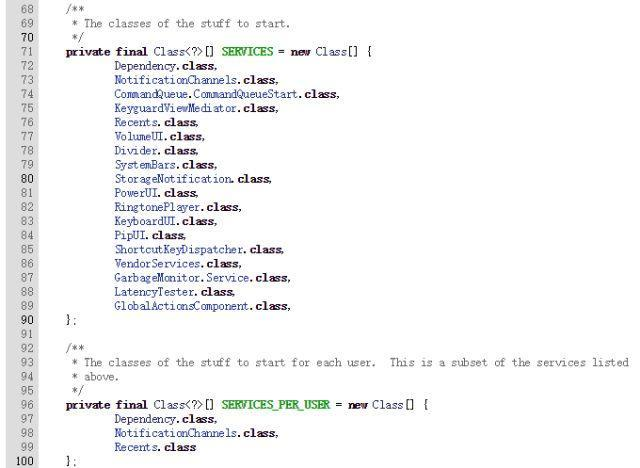 SystemServer负责系统中各种重要服务的启动,不巧,由于SystemUI的重要性,她也在被启动之列,虽然是处于“Other”的地位~(SystemServer的代码对系统服务类别大体分为三类:Bootstrap->Core->Other,SystemUI的启动就在Other中)。