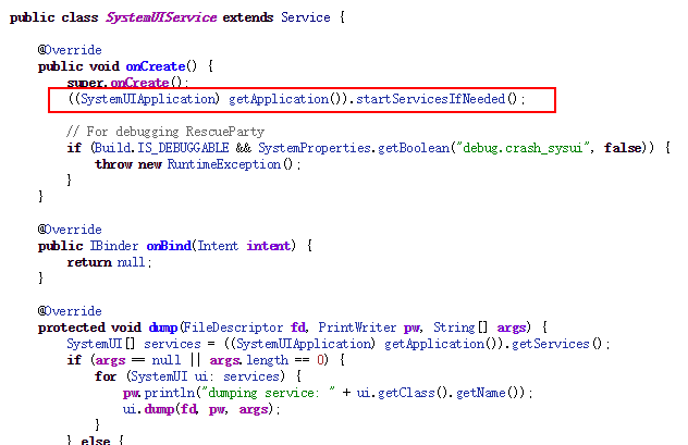 整个服务,真正干活的只有红框中的一句话。仔细瞅瞅,调用的是SystemUIApplication中的startServicesIfNeeded方法,转了一圈又回来了。