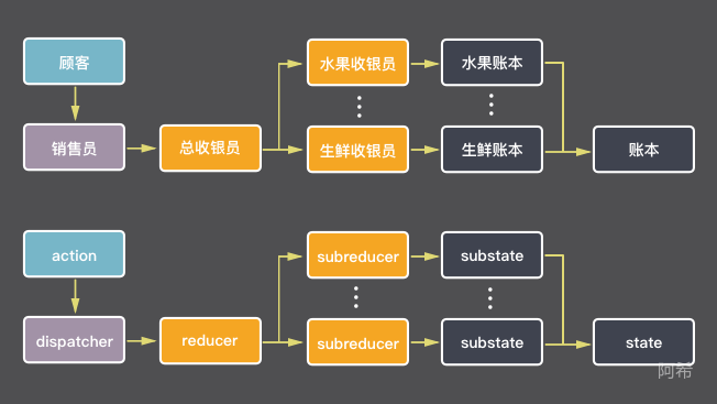 但是阿大并不想看各个部门的分账本,他只想看一个总账本就好了。刚好 redux 提供了 combineReducers 功能,可以把各个收银员管理的账本合起来: