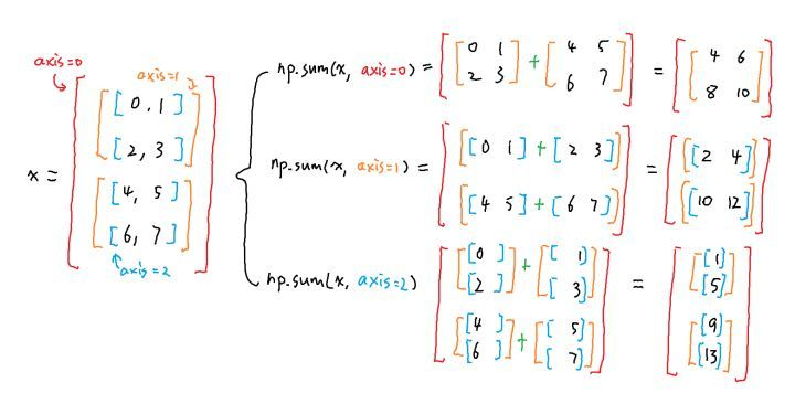如果一个多维数组的 shape 是 (a1, a2, a3, a4), 那么延轴0计算最后的数组shape 是 (a2, a3, a4), 延轴1计算最后的数组shape是 (a1, a3, a4)