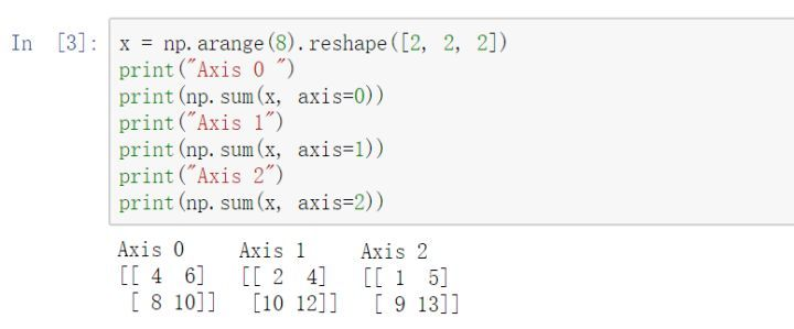 对于多维数组,numpy对轴的编号是先行后列,由外向内!最外面的括号代表着 axis=0,依次往里的括号对应的 axis 的计数就依次加 1,所以,第三个轴(轴2)即为最内层数组的行方向